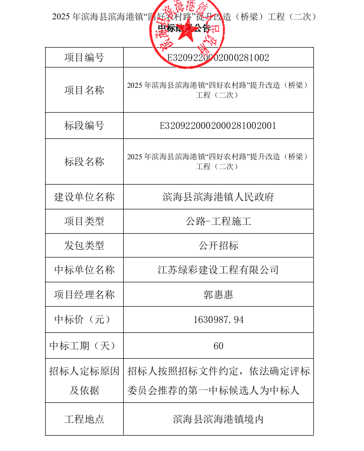 2025年滨海县滨海港镇“四好农村路”提升改造(桥梁)工程(二次)中标结果公告