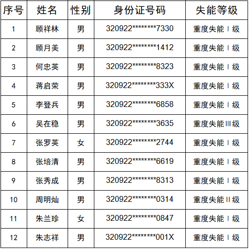 根据《盐城市长期护理保险失能等级评估管理办法》规定,经综合评估,拟确定以下12名参保人员符合盐城市长期护理保险重度失能等级标准,现予以公示。公示期限为5个工作日。