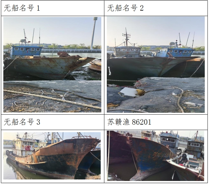 2025年4月3日,盐城市县两级农业综合执法机构联合在滨海县翻身河渔港内发现涉嫌涉渔“三无”船舶4艘,因无法联系相关权利人(所有权人、经营人及其他权利人),上述船舶已转移至指定地点停放。请船舶所有人自本公告发布之日起60日内,携带有效身份证件、船舶相关证书原件(所有权证书、国籍证书、检验证书和渔业捕捞许可证等)前来认领,并依法接受调查处理。规定期限内未认领的,一律视为无主船舶,我单位将按涉渔“三无”船舶依法予以处理。
