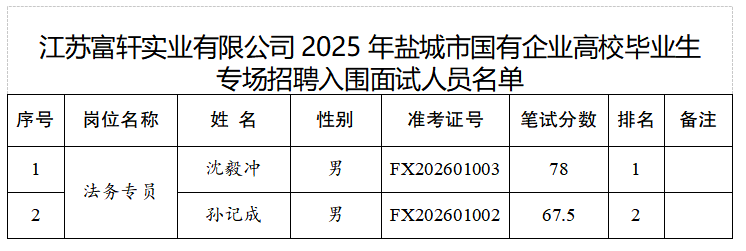 江苏富轩实业有限公司2025年盐城市国有企业高校毕业生专场招聘入围面试人员名单公布