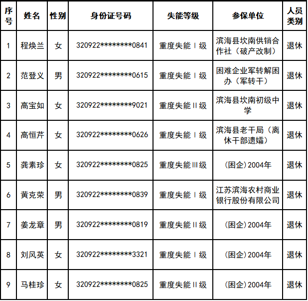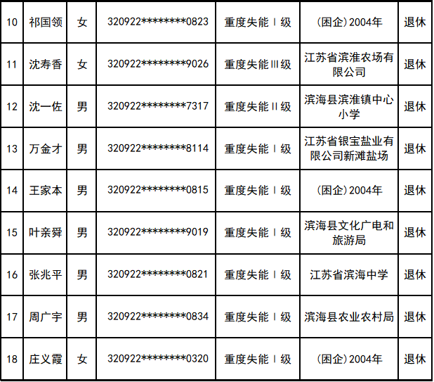 根据《盐城市长期护理保险失能等级评估管理办法》规定,经综合评估,拟确定以下18名参保人员符合盐城市长期护理保险重度失能等级标准,现予以公示。公示期限为5个工作日。